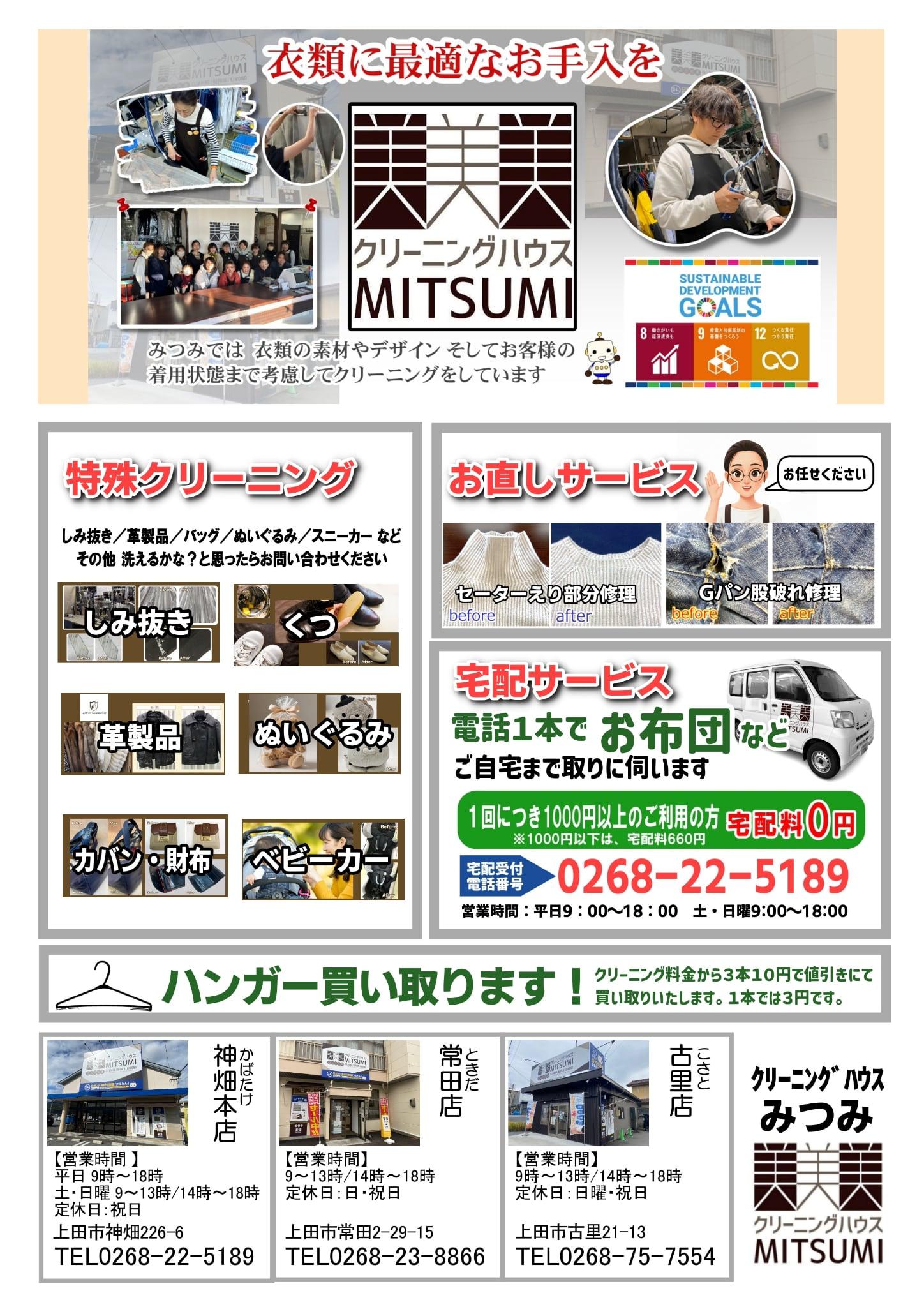 【プロが手掛ける、環境に優しいクリーニングサービス】 クリーニングハウスみつみでは、あなたの日常から特別な一日まで、大切な衣類を守り、長く愛用できるお手伝いをしています。 日常衣類のケアはシャツやスーツ、コートまで、毎日着るものを丁寧にクリーニング。 特別な衣類のドレスや着物のケアも安心してお任せください! シミ抜きのプロが食べこぼしや汗ジミもキレイにリフレッシュ。 素材に合ったお手入れでウール、シルク、カシミアも最適な方法で大切に扱います。 衣類を清潔に保つだけでなく、長持ちさせて持続可能な未来へ一歩前進します。 SDGsの目標達成に貢献しながら、エコで安心なクリーニングを提供します。 皆様もぜひご利用ください! お待ちしております。